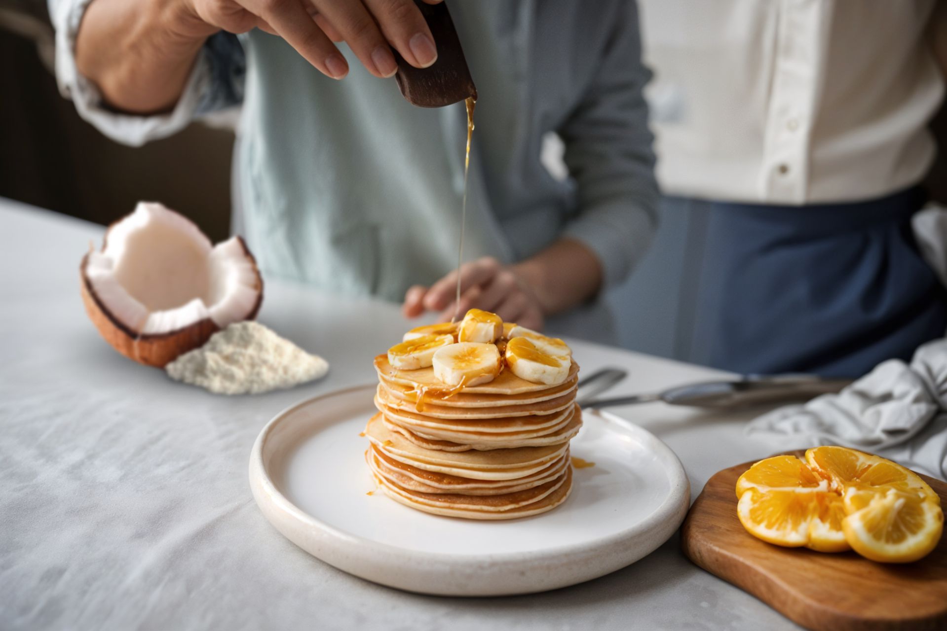 Recipe – In a bowl, mix coconut kokopo coconut flour, baking powder, salt, and cardamom powder. In another bowl, whisk together kokopo coconut milk, kokopo coconut sugar, kokopo coconut oil, and vanilla extract until smooth. Gradually combine the wet and dry ingredients, stirring well to form a thick batter. Fold in freshly grated coconut for extra texture and flavor. Heat a non-stick pan and grease it with kokopo coconut butter . Pour a small ladleful of batter and spread gently. Cook each pancake for about 2 minutes on one side, then flip and cook for another minute until golden brown. Stack the pancakes and serve warm with sliced bananas and a drizzle of kokopo coconut honey